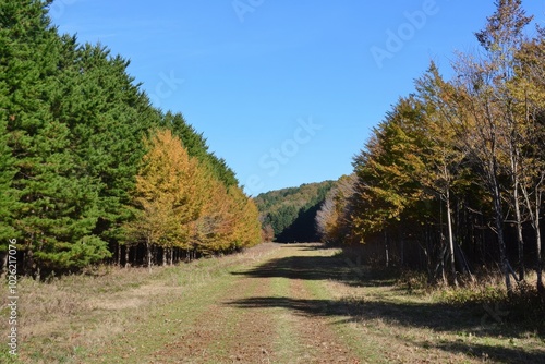 © Atlas, Fototapeta premium A serene autumn pathway lined with vibrant trees under a clear blue sky