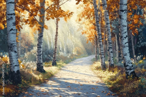 Fototapeta premium A serene autumn pathway surrounded by golden birch trees illuminated by soft sunlight.