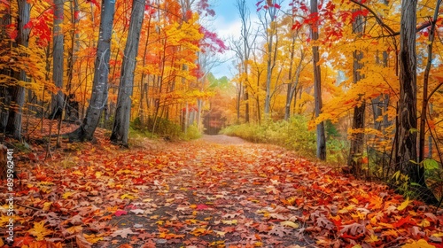© Thirawat, Obraz premium A serene autumn scene with a trail covered in fallen leaves, leading through a forest of trees displaying a brilliant array of fall colors under a bright sky