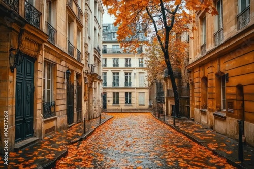 © BerkahStock, Fototapeta premium A serene autumn street lined with fallen leaves and charming architecture.