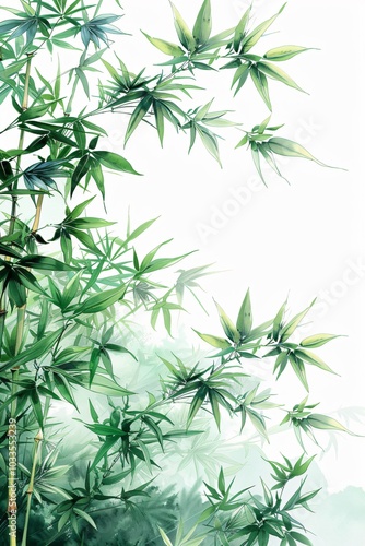 Fototapeta premium A serene background featuring a lush bamboo forest, with vibrant green bamboo stalks and delicate leaves creating a tranquil atmosphere. The image captures the essence of nature's beauty and simplicit