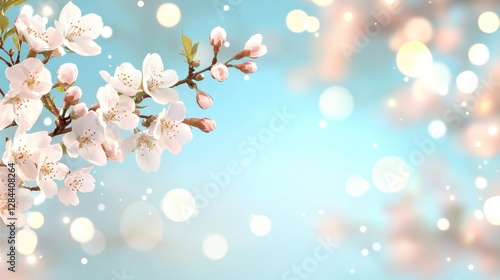 Fototapeta premium A serene background featuring delicate cherry blossoms against a soft blue, with bokeh effects creating a dreamy atmosphere.