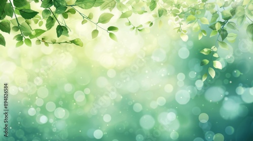 Fototapeta premium A serene background featuring soft green leaves and blurred bokeh lights,...