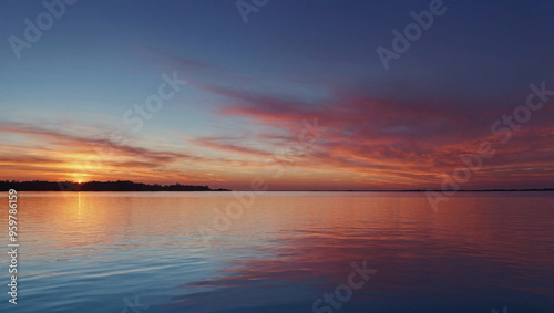 © claudunia, Fototapeta premium a serene background featuring the reflection of a gradient mesh sunset on a calm body of water.