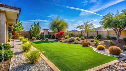 © Sujid, Naklejka premium A serene backyard oasis showcasing sustainable living with artificial turf, drought-resistant plants, and eco-friendly landscaping under clear blue skies.