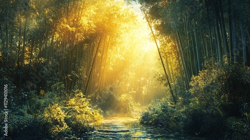 Obraz premium A serene bamboo forest with golden light filtering through the trees, illuminating a tranquil stream surrounded by lush greenery.