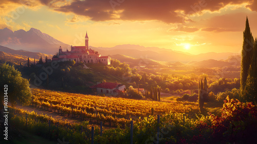 © Pter, Naklejka premium A Serene Baroque Countryside Landscape with Rolling Hills, Lavish Estate, and a Dramatic Sunset Sky Enhancing the Idyllic Atmosphere