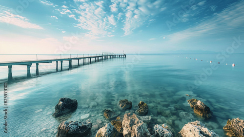 Obraz premium a serene bay with a pier stretching out into the calm waters, inviting...