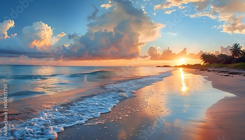 Naklejka premium a serene beach at sunset, with golden sands and vibrant clouds painting the sky