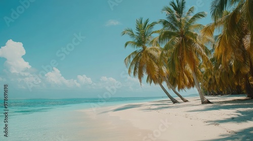 © Theeranan, Obraz premium A serene beach on a tropical island in the Maldives, with palm trees swaying in the breeze.