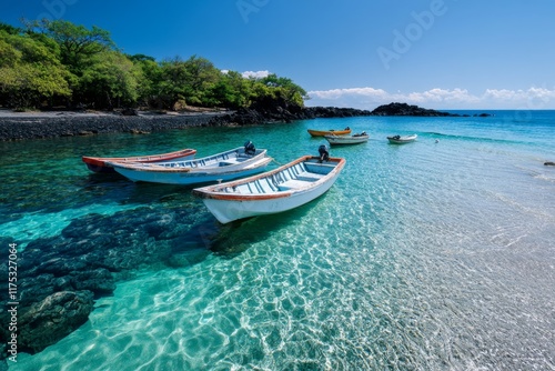 Naklejka premium A serene beach on Jeju Island, with black volcanic rocks, clear waters, and colorful fishing boats anchored nearby