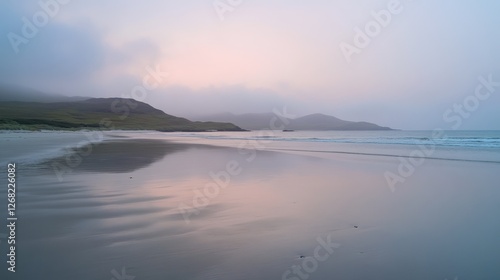 © Tom, Fototapeta premium A serene beach scene at dawn, featuring gentle waves lapping against the shore with misty mountains in the background.