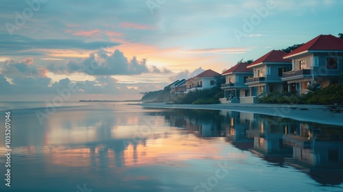 © Vii, Fototapeta premium A serene beach scene at sunset with houses in the background, ideal for travel or real estate projects