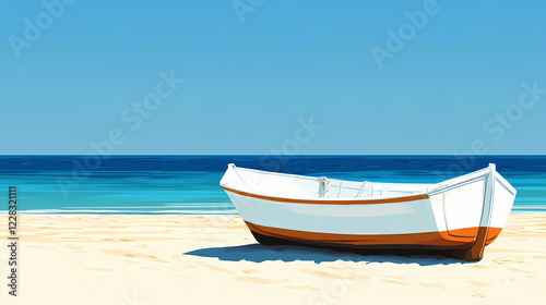 © Thiago, Naklejka premium A serene beach scene featuring a white and orange boat resting on sandy shores under a clear blue sky. Sapphire Shores. Illustration