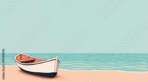 © PoyTumStudio, Naklejka premium A serene beach scene featuring a white boat resting on golden sand