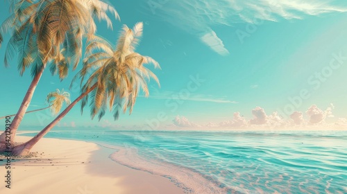 Obraz premium A serene beach scene represents an ideal summer vacation spot, with beautiful palm trees and a turquoise ocean under a clear, blue sky