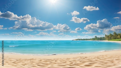 © MST, Fototapeta premium A serene beach scene under a bright, clear blue sky.