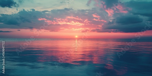 © vefimov, Obraz premium A serene beach scene with a vibrant sunset, reflecting on the calm ocean waters.