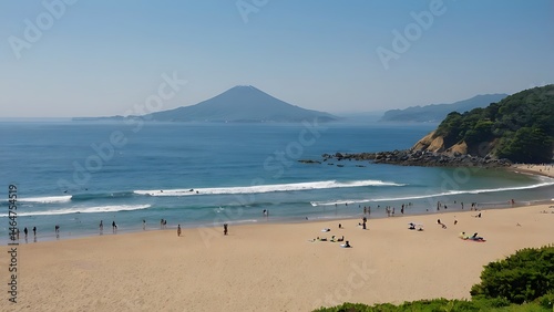 Fototapeta premium A serene beach scene with gentle waves, people enjoying the sun, and a distant mountain under a clear blue sky.
