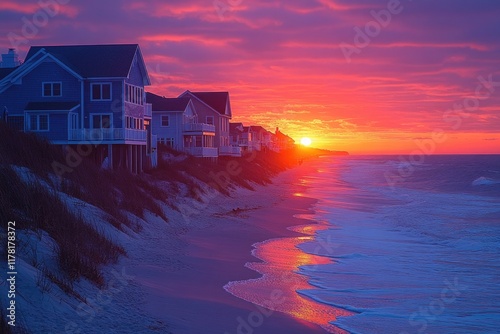 © Ева Поликарпова, Fototapeta premium A serene beach scene with houses in the background as the sun sets