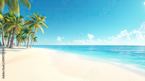 © fara, Fototapeta premium A serene beach scene with palm trees and clear blue water under a bright sky.