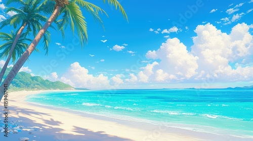 © darion, Obraz premium A serene beach scene with palm trees and vibrant blue waters under a clear sky.