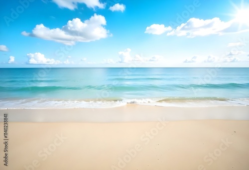© Sharif54, Fototapeta premium A serene beach with golden sand, calm turquoise waters, and a clear blue sky with wispy clouds