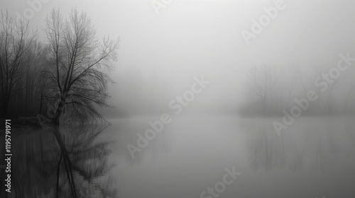 Fototapeta premium A serene black and white image of a foggy lake with the silhouette of a bare...