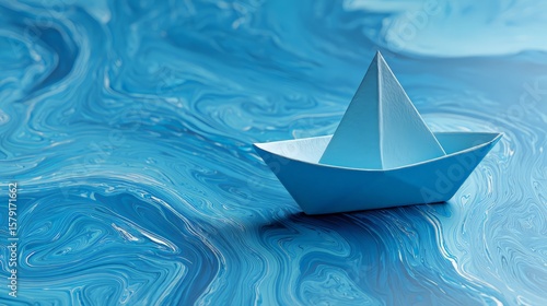 © Aris Suwanmalee, Obraz premium A serene blue background featuring a delicate paper boat, symbolizing calm and creativity.