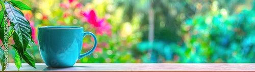 © Jodkung, Obraz premium A serene blue cup on a wooden table with vibrant garden background.