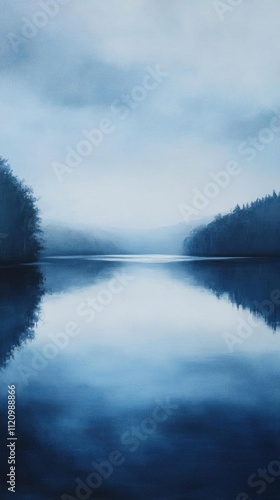 © Jehana, Fototapeta premium A serene blue landscape reflecting calm waters and misty hills.