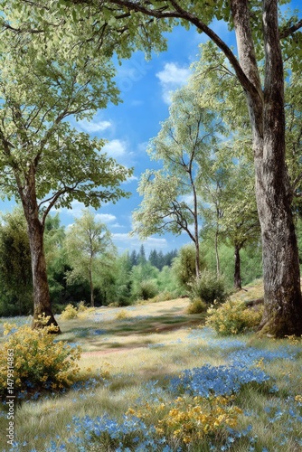 © Naiuang, Fototapeta premium A serene, blurred spring background with a blooming glade of wildflowers and young trees in full bloom