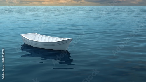 © Aris Suwanmalee, Naklejka premium A serene boat floats peacefully on calm blue water, reflecting the sky and surrounded by tranquility.
