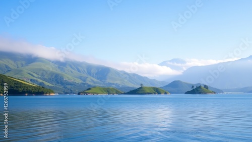 Naklejka premium a serene body of water surrounded by islands, with majestic mountains rising in the background