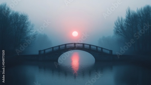 Naklejka premium A serene bridge emerges through mist at sunrise, reflecting tranquil water....