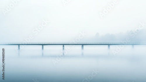 © BerkahStock, Naklejka premium A serene bridge shrouded in fog over calm waters, evoking tranquility and solitude.