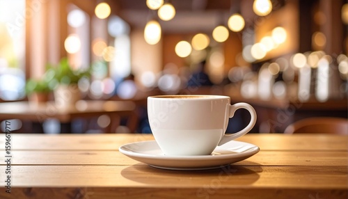 © geny, Obraz premium A serene cafe scene featuring a cup of coffee on a wooden table.