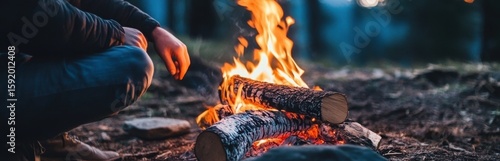 © Molly P, Fototapeta premium A serene campfire scene featuring glowing flames and stacked logs in a natural environment. Ideal for conveying warmth, relaxation, and outdoor adventures.