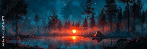 Naklejka premium A serene campsite by a forest lake under starlit skies is illuminated by a vibrant sunset ideal for promoting outdoor adventures, travel brochures, relaxation themes, and nature retreats,