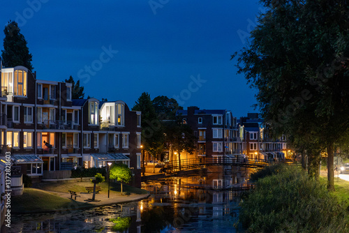 Fototapeta premium A serene canal scene at dusk, with modern brick buildings illuminated by warm...
