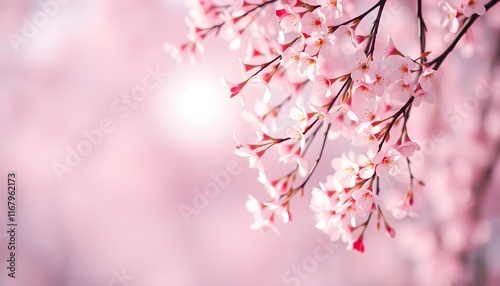 © MFR Collection, Obraz premium A serene cherry blossom background featuring delicate pink petals cascading gently, set against a soft and dreamy gradient