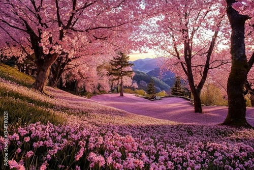 Naklejka premium A serene cherry blossom forest in full bloom.