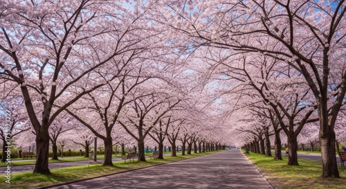 © RaNy, Obraz premium A serene cherry blossom-lined path in a park, with a clear blue sky and a gentle breeze.