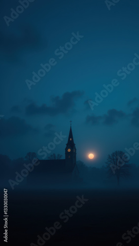 © Tameem, Obraz premium A serene Christian church scene at night with a full moon and misty surroundings.