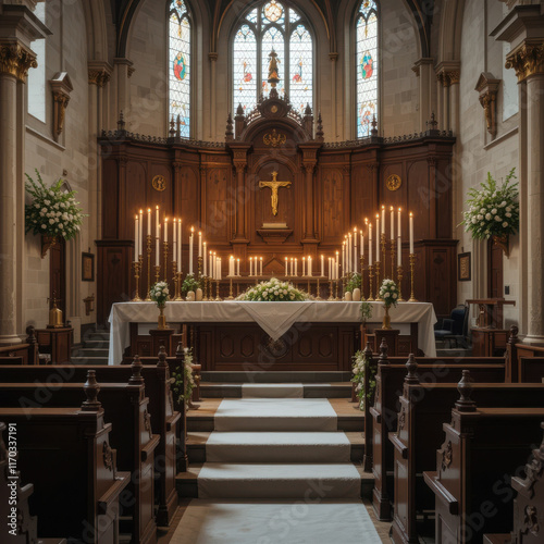 © LiaSyafitri, Fototapeta premium A serene church interior with candles and floral arrangements.