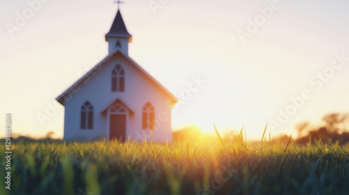 © kept, Fototapeta premium A serene church silhouette against a vibrant sunset, surrounded by lush green grass.