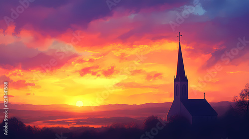 © Thiago, Obraz premium A serene church spire reaching towards a vibrant sunrise, illuminating the sky with warm colors and creating a peaceful atmosphere. Vibrant Spire. Illustration