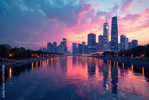 © Kachaphot, Fototapeta premium A serene cityscape at dusk with skyscrapers and a river in the background , architecture, #cityscape