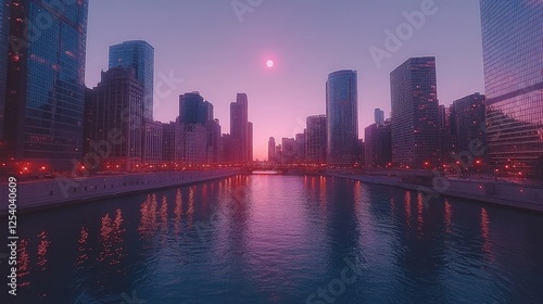 © Stockfish, Fototapeta premium A serene cityscape at sunset, reflecting vibrant colors on the water.