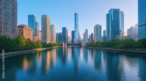 Naklejka premium A serene cityscape reflecting skyscrapers along a calm river at dawn.